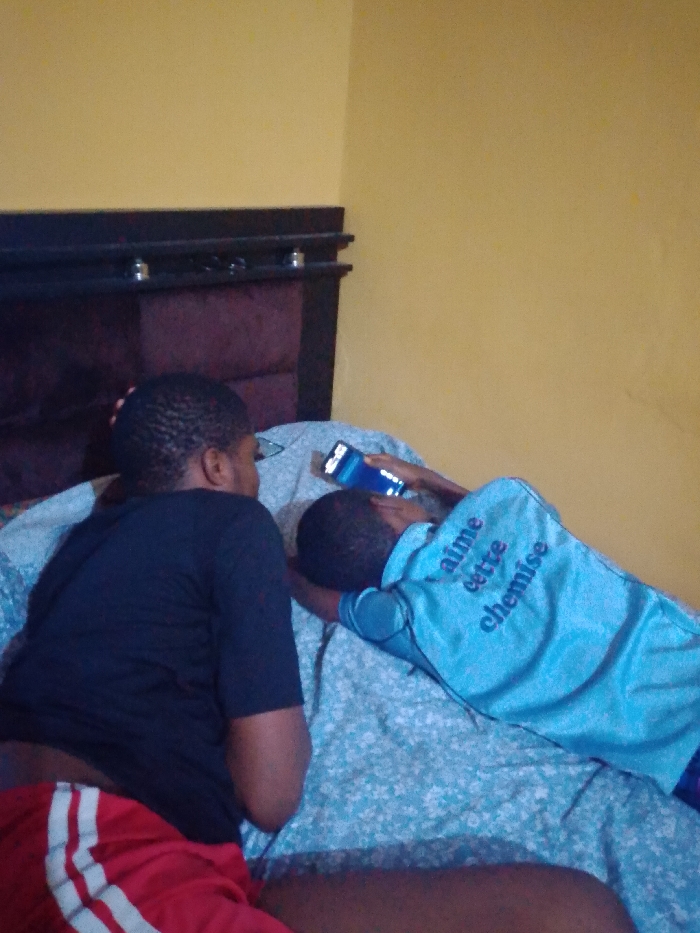 Inside a room in Mgbuoshimini, Nigeria, two individuals are positioned on a bed with a dark brown upholstered headboard and a light blue patterned sheet