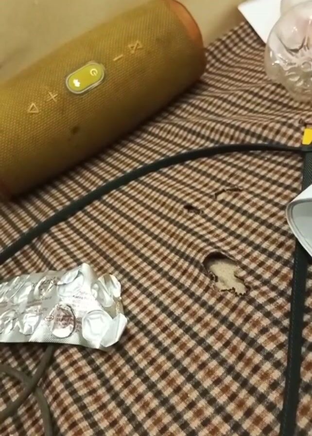collection of items on a brown and beige checkered surface, possibly a bedspread or blanket. To the left, there is a cylindrical, golden-brown speaker with visible control buttons. Next to the speaker, there is a foil blister pack of pills or capsules, mostly empty. In the middle of the frame, there is a small hole in the fabric. To the right, there is a clear plastic water bottle, a roll of white paper, and other obscured objects. A black cord snakes across the surface, connecting to some unknown device. The camera angle is a high-angle shot, panning across the scene from left to right.