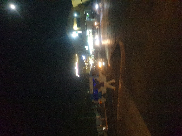 A nighttime scene shows a dark street with a row of buildings illuminated by lights. The buildings have bright white and yellowish lights, and some are adorned with decorative lighting. A sidewalk is visible next to the street. The left side of the image is dominated by a dark sky, with a bright moon or other celestial light source. The overall impression is a blend of urban and natural light in a dimly lit environment.