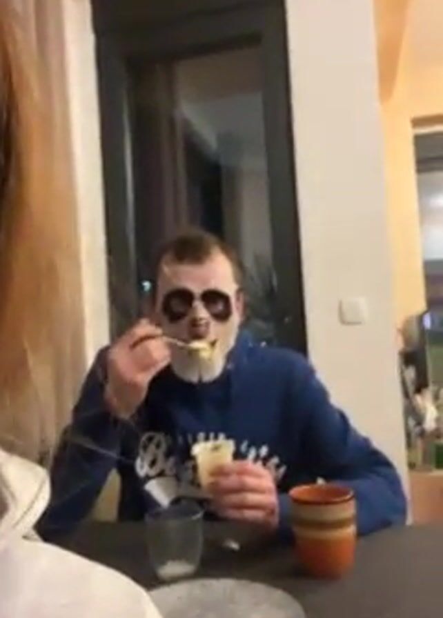 A woman holds a cell phone in front of her, seemingly recording a video. The camera's focus is on a man seated at a dining table in the background. The man is wearing a blue hoodie with white lettering. He has a white facial mask with black circles around his eyes and a black nose, resembling a panda. He is eating something from a small white container with a spoon. On the table, there is a clear glass, a decorative plate, and a brown and orange striped mug. A window with a black frame is visible behind the man. The room appears to be a dining area.