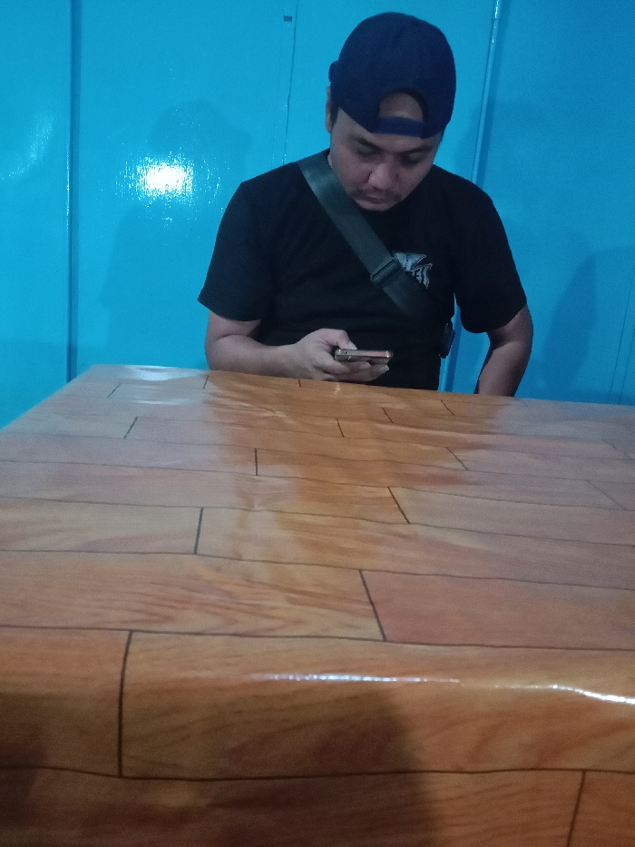 The scene takes place in a room with a blue wall and a wood-patterned table. A man wearing a black shirt, a blue cap, and a grey strap is sitting at the table. He is looking down and holding a cell phone in his right hand. The man is positioned on the right side of the image, with his back to the camera, and his body facing towards the left. The wood-patterned table is in the foreground and is taking up most of the image. The blue wall is in the background and is partly visible. The man appears to be using the cell phone. The location of the scene is Kecamatan Kaliwungu Selatan, Indonesia, based on the provided coordinates.