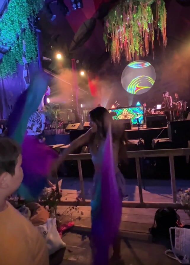A woman dances with two large, colorful fans in front of a stage. The fans are a blend of blue, purple, and white hues. She wears a light blue halter top and a matching purple skirt. Her hair is long and dark. In the background, a band plays on a stage decorated with plants and flowers. Lighting fixtures are visible overhead. There is a large circular screen displaying a swirl of colors. A cameraman records the performance. In the foreground, a child in a yellow shirt watches the dancer. Other objects, including bags and baskets, are scattered around the wooden deck.
