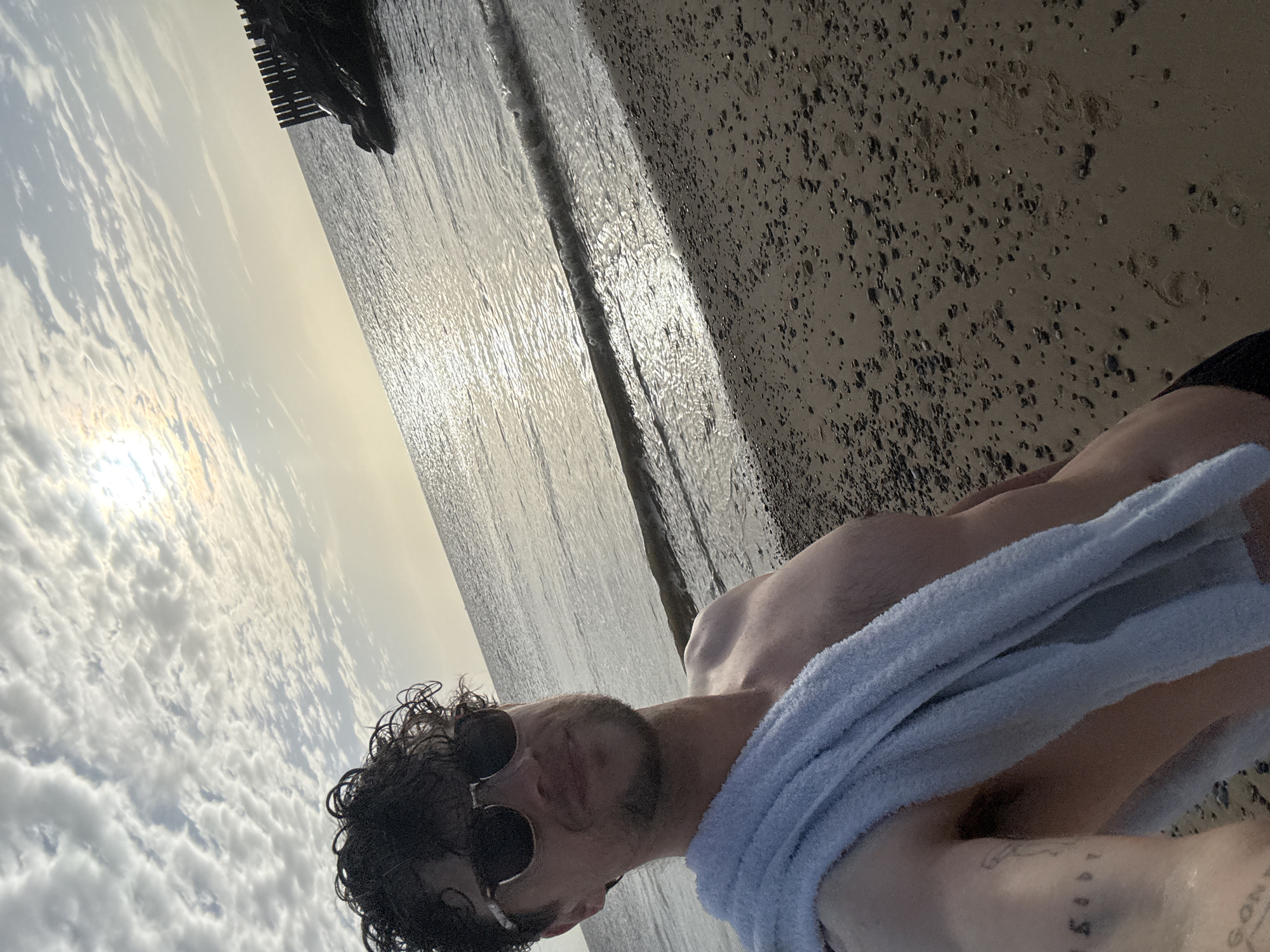 shirtless man wearing sunglasses and a light blue towel draped over his shoulder, standing on a beach in East Suffolk, United Kingdom. The beach appears to be wet and sandy, with pebbles scattered across the surface. Behind the man is the sea, with a wave approaching the shore. In the distance, there is a wooden structure partially submerged in the water. The sky is cloudy, with the sun visible through the clouds. The man has dark, curly hair and a beard, and appears to have tattoos on his arm.