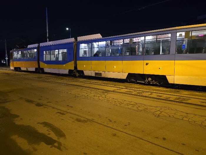 - "The image displays a multi-section tram, painted with a blue upper half and a yellow lower half separated by a narrow light gray horizontal stripe, stationary on tram tracks at night in Sofia, Bulgaria" by FM-IrpsO2, licensed under CC BY 4.0
