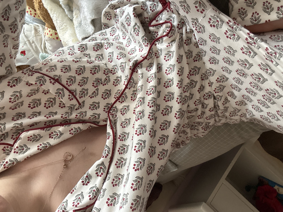 person in patterned pajamas with red piping. The pajamas are light-colored with a repeated design of small leaves or floral clusters in shades of red and gray. A gold necklace rests on the person's chest, visible beneath the pajama top. Part of a white shelf or drawer unit appears in the lower right corner, with some items inside. Other soft items, possibly blankets or a stuffed animal, are visible in the upper left corner.