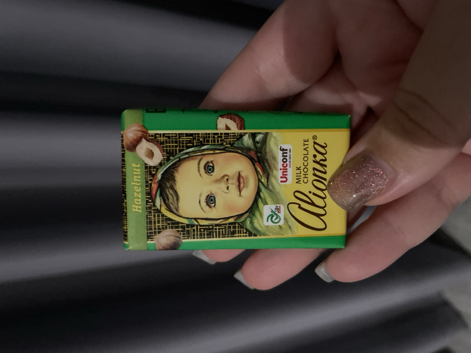 A hand holds a small, rectangular chocolate bar. The bar's wrapper is green and yellow with images of hazelnuts and a baby with blue eyes wearing a headscarf. "Alionka" and "Milk Chocolate" are printed on the wrapper. The thumbnail of the hand holding the chocolate has pink glitter nail polish. A blurry dark gray and black background is visible behind the hand and chocolate bar.