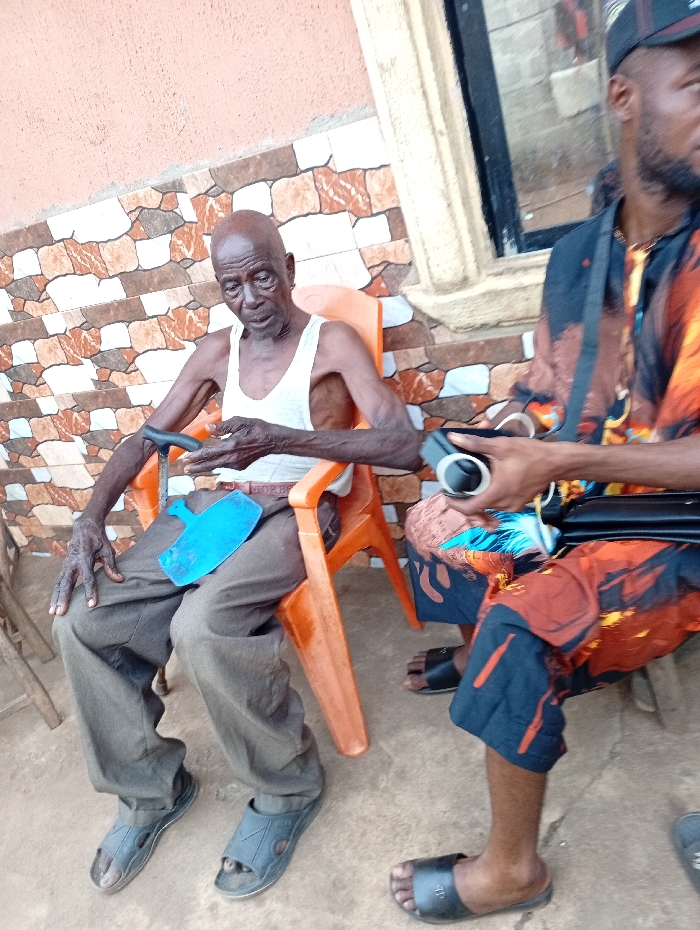 An elderly, frail man in a white tank top and gray pants sits in an orange plastic chair. He holds a black cane and a blue object on his lap. A younger man in an orange and black patterned shirt and black cap sits beside him. Both men wear sandals. They are outside a building with tan siding and decorative brickwork. The younger man holds a set of headphones in his lap.