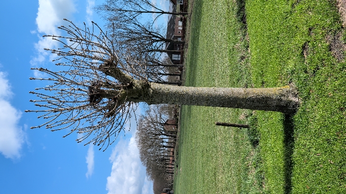 The scene is located in Stevensbeek, Netherlands. A solitary, pollarded tree dominates the foreground, its grey-brown trunk centered. The tree is leafless, displaying a dense crown of numerous thin branches tipped with visible buds. A bird's nest is embedded within the upper branches. The ground is covered in vibrant green grass, with a thin dark brown wooden post partially visible to the tree's left. Sunlight casts a distinct shadow of the tree onto the grass. In the background, a continuous line of similar bare trees marks a distant boundary. Beyond this tree line, several brick buildings with dark roofs are discernable. The sky is clear blue with sparse white cumulus clouds. No individuals or active interactions are observed.