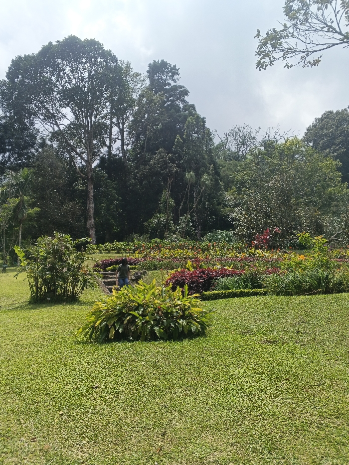 Lush green lawn extends from foreground to midground, punctuated by a vibrant bush. A person ascends stone steps leading into a garden with a variety of colorful flowers and shrubs. A dense forest of trees rises in the background, reaching towards an overcast sky. The scene evokes a serene and well-manicured landscape.