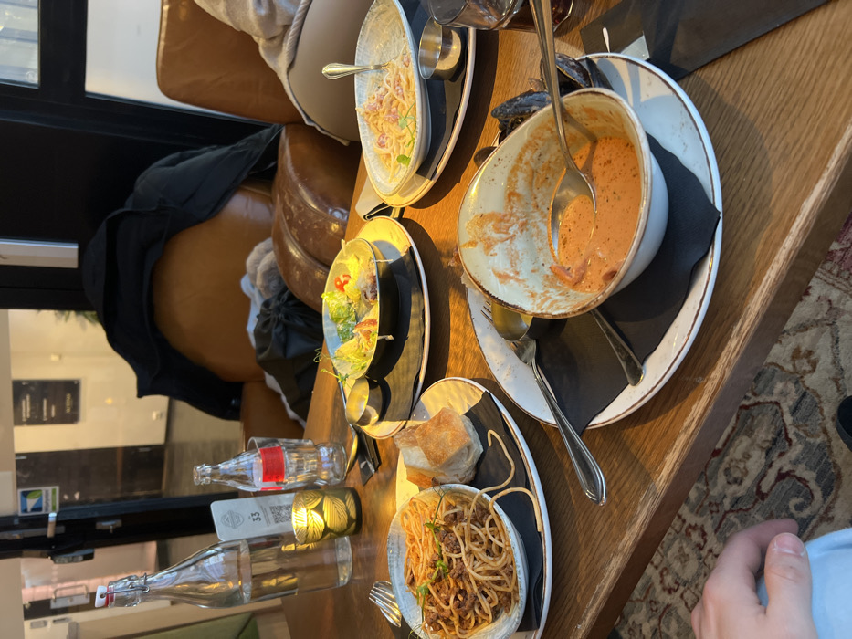 The image depicts an indoor dining establishment in Tromsø, Norway, observed from a slightly elevated perspective over a wooden table. On the wooden table, four place settings are visible, each with a white plate and a black napkin. From left to right: a white bowl contains mostly eaten spaghetti with a meat sauce and a fork, positioned next to a piece of light-colored bread. To its right, another white bowl holds the remnants of a green salad. Further right, a white bowl contains mostly eaten pasta with a creamy sauce and a fork. The closest bowl to the viewer contains a reddish-orange soup or sauce, partially consumed, with a spoon resting within it; several dark mussel shells are visible around its rim. Other objects on the table include a tall, clear glass bottle of water with a swing-top stopper, an empty glass Coca-Cola bottle, and a small metal candle holder with a lit candle emitting a warm glow. A small card with a circular logo, the number "33," and a QR code is placed between the water bottle and the candle. Small metal condiment cups are present near the salad and creamy pasta dishes. A dark beverage glass is partially visible on the far right. In the bottom left of the frame, a person's left hand and forearm, wearing a light blue sleeve, rest on the table. On the far right, the side of another person's torso or lap, dressed in light-colored fabric, is visible. The presence of multiple consumed dishes indicates at least two to four individuals were or are present at the table. The background features dark brown leather armchairs. A black winter jacket is draped over one armchair, and a dark bag rests on another. Large glass panels or doors separate the dining area from another space, reflecting ambient light. A blue and green logo sticker is affixed to one of the glass panels. A blurry, dark sign with white text is discernible through the glass in the far background. The floor is covered with a patterned rug. The overall lighting is subdued and warm.