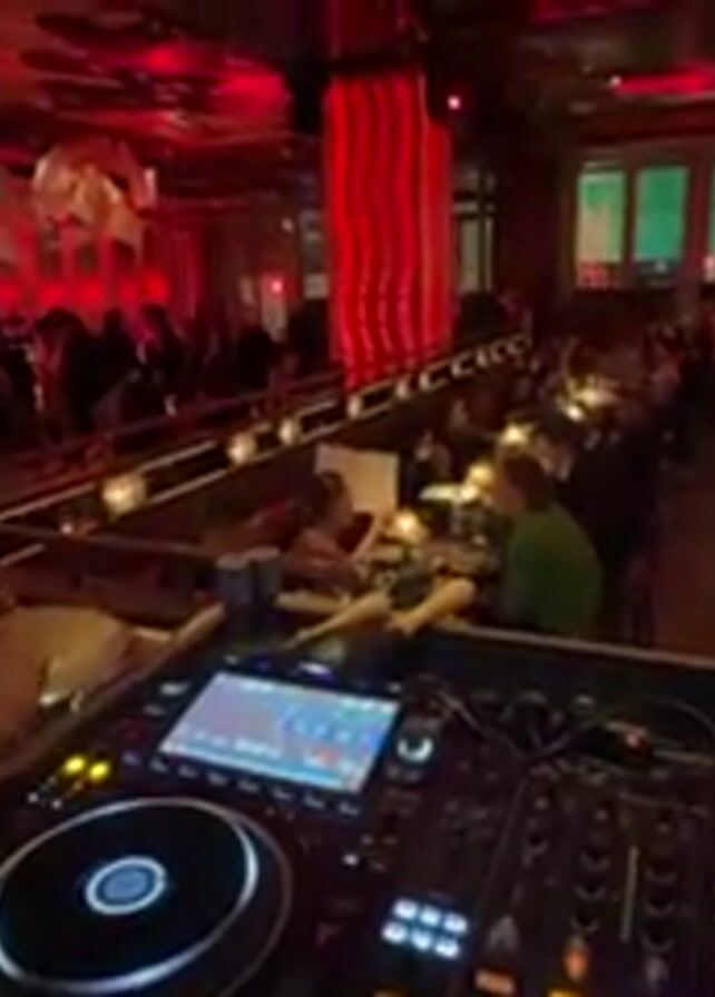 DJ performing in a dimly lit, crowded restaurant. The DJ, a dark-haired man with a beard, stands behind a professional DJ mixer. He wears a black shirt. In the foreground are various buttons and knobs of the DJ equipment, with brightly colored lights. In the background, the restaurant is packed with people sitting at tables. The room has a red ambiance, with red vertical drapes and a ceiling decorated with floral patterns. There's a mezzanine level visible where more patrons are seated. The atmosphere appears lively and social.