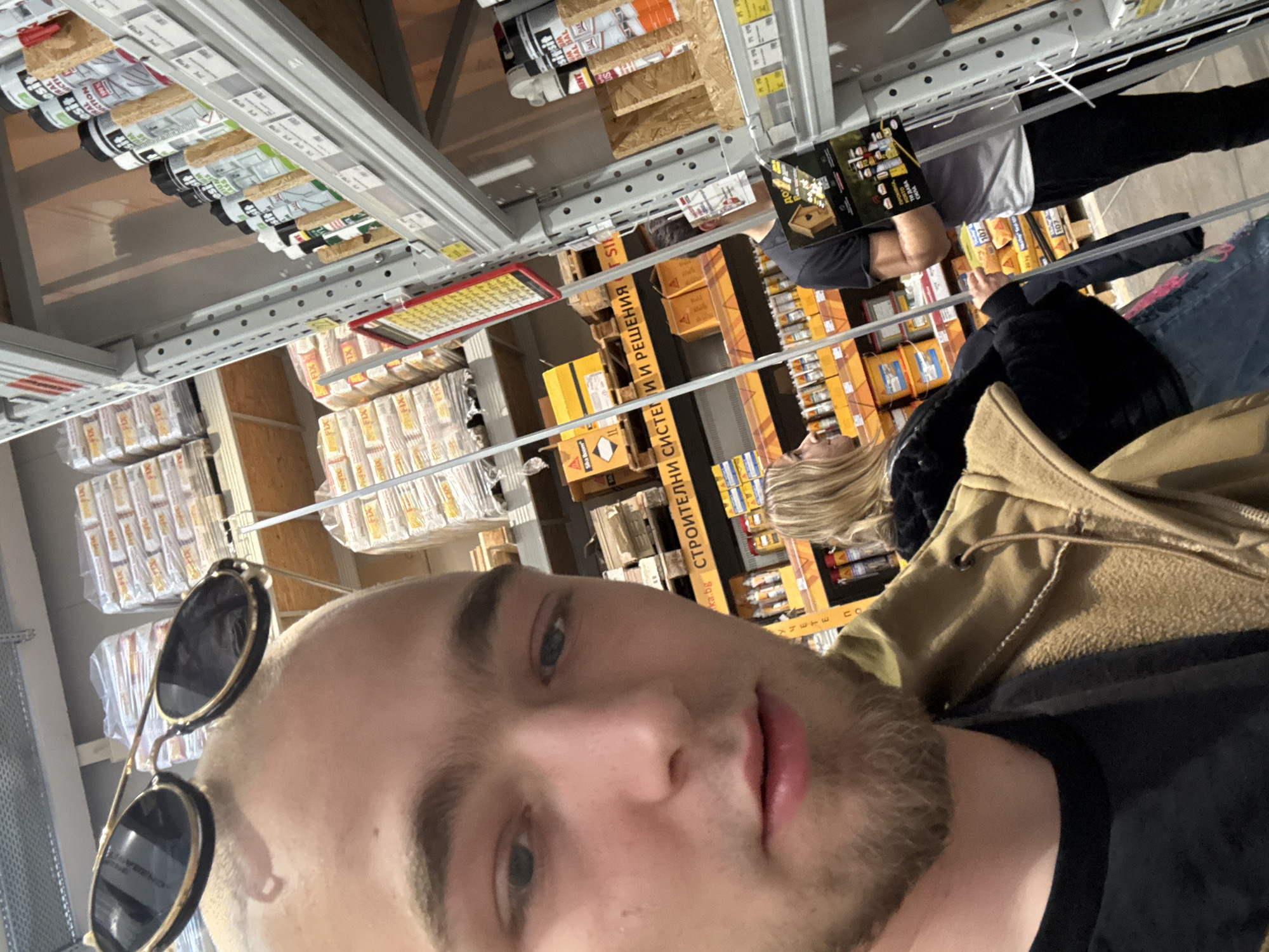A young male with a shaved blonde head and short blonde beard, wearing sunglasses perched on his head and a tan hooded jacket over a black shirt, takes an upward-angled selfie, looking directly into the camera. The scene is set inside a construction or home improvement store, identified by Cyrillic signage including "СТРОИТЕЛНИ СИСТЕМИ И РЕШЕНИЯ" (Building Systems and Solutions) and the website "arka.bg", indicating an Arka hypermarket in Sofia, Bulgaria. The background features extensive grey metal shelving units. Upper shelves are stacked with pallets containing large quantities of packaged building materials, specifically bags of cement or mortar with "FIX" and "PROFIX" branding. Lower shelves display numerous cans and tubes of various construction chemicals, sealants, and adhesives, with brands such as "Sika," "Ceresit," "Baufix," and "Den Braven" visible. Two additional individuals are present in the background: a blonde-haired female, partially visible, wearing a dark jacket and blue jeans with colorful patterns, and a male seen from behind, dressed in a black t-shirt and black pants, holding a flyer depicting a birdhouse. All individuals appear to be shopping within the store environment.