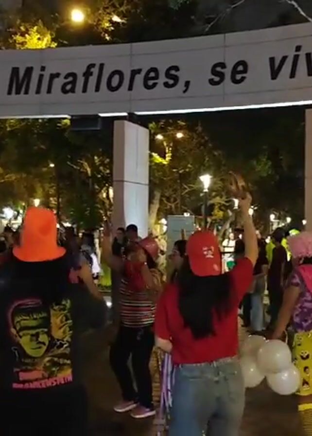 A crowd gathers at night beneath an archway bearing the words "Miraflores, se vive mejor" (Miraflores, life is better)