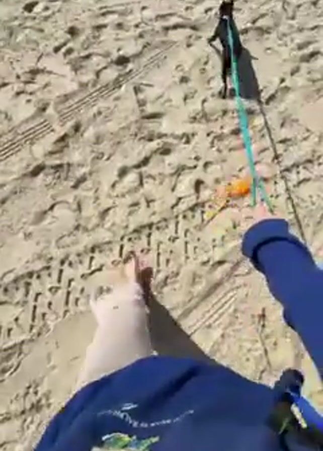 A person walks on a sandy beach, holding a blue leash attached to a small black dog. The person is wearing tan pants and a blue long-sleeved shirt. The beach is covered in tire tracks and footprints. The sky is bright, suggesting a sunny day. The camera view is from the person's perspective, looking down at their legs and the dog in front.