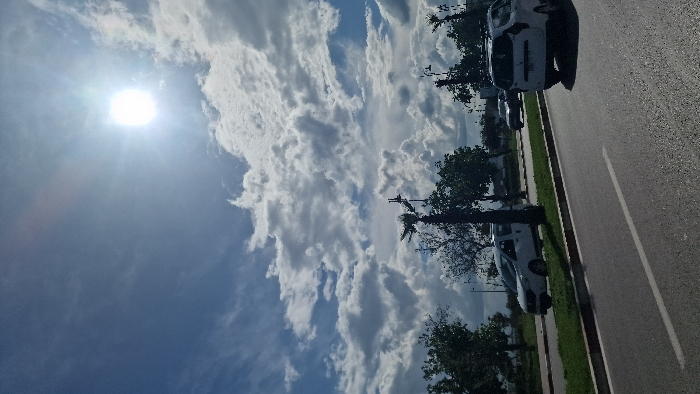 The image displays a daytime street scene in Fez, Morocco. The upper portion of the frame is dominated by a partly cloudy sky, with a bright sun positioned in the upper right quadrant, emitting visible lens flare. Numerous white and grey cumulus clouds are scattered across a light blue sky. The lower portion of the image depicts a multi-lane asphalt road with a visible white lane marking in the foreground. A landscaped median strip separates the visible lanes, featuring green grass and several trees, including those resembling palm trees and others with dense green foliage. On the far side of the median, a white utility van, consistent with a Renault Kangoo, is visible, positioned behind a tree. In the immediate right foreground, the rear of a white SUV, consistent with a Dacia Duster, is present, facing away from the viewer. Further down the road, a dark-colored sedan is visible in the distance. Two decorative streetlights with tree-like structures are erected along the median. No individuals are visible within the frame.