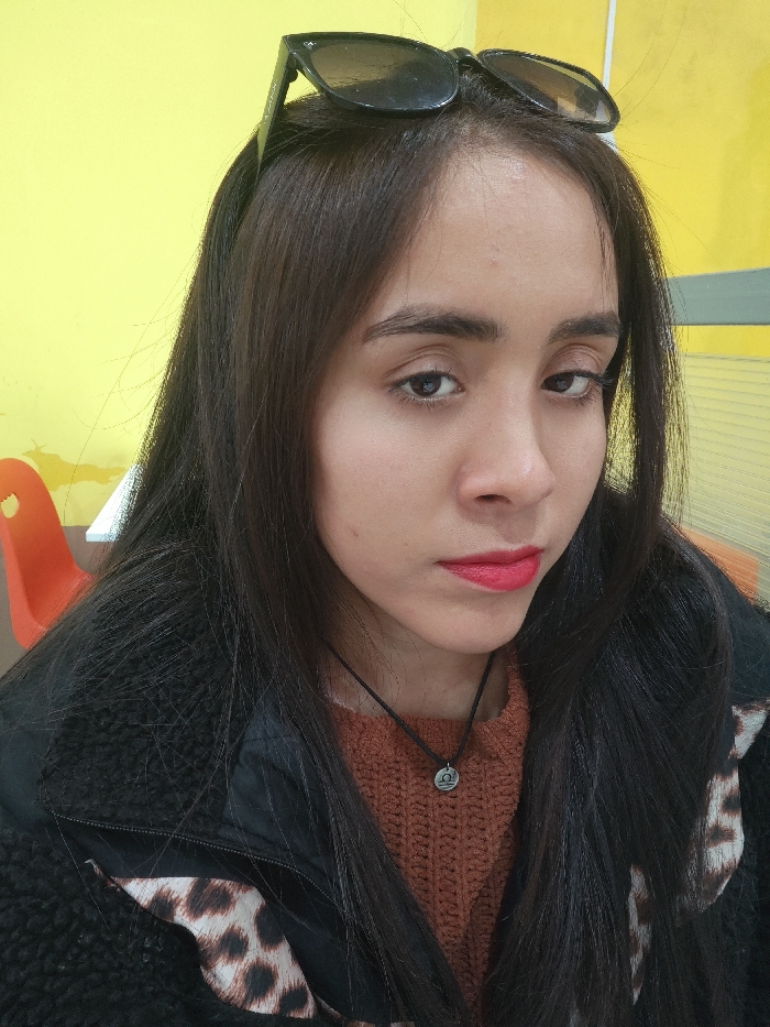 The image captures a female individual in an indoor setting within the city of Wanchaq, Peru. The subject is seen from the chest up, directly facing the viewer. She has long, straight dark brown hair, dark eyes, and is wearing red lipstick. Black sunglasses rest on top of her head. She is dressed in a black, textured jacket, possibly sherpa or faux fur, layered over a brown knitted sweater. A black cord necklace with a small, circular silver-toned pendant depicting the astrological symbol for Libra is visible around her neck. A garment with a leopard print pattern is partially visible beneath her jacket. The background features a solid bright yellow wall. To the left, an orange chair with a distinct circular cut-out in its backrest and a small portion of a white surface, likely a table, are visible.