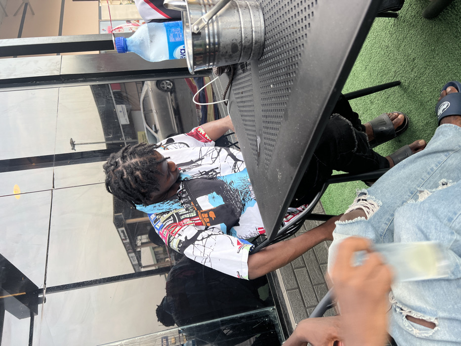 The image depicts an outdoor seating area, likely at a restaurant or cafe, in Ikeja, Nigeria. **Scene Overview:** Two individuals are seated at a black, rectangular outdoor table with a perforated surface, positioned on a green artificial turf ground. A large reflective glass wall forms the background, mirroring a street scene. **People:** 1. **Main Subject:** A dark-skinned individual with short, braided hair (locs) is seated in a black metal-framed chair. They are wearing a short-sleeved, collared shirt with a multi-colored, abstract pattern featuring cityscapes and bicycles on a white background, dark pants (possibly ripped jeans), and dark slides/sandals. Their head is tilted downwards, eyes focused on an unseen object below the table. 2. **Foreground Subject:** Partially visible on the left, a second individual is seated, wearing light blue ripped jeans and dark blue slides with white branding. Their right hand, blurred due to motion, holds a clear plastic cup containing a light-colored liquid. **Objects on Table:** * One clear plastic bottle of "Eva" brand water with a blue label and cap, exhibiting condensation. * One metallic bucket with a handle, also showing condensation, containing two stainless steel straws or stirrers. * A white cable, possibly a charging cable, rests near the water bottle. **Environment:** * The ground beneath the table and chairs is covered with green artificial turf. * The background features a reflective glass wall, mirroring a street scene. Reflections include a silver sedan (possibly a Chevrolet Malibu) on a road, a street light pole, and a commercial building structure, possibly a petrol station canopy. The sky appears overcast.