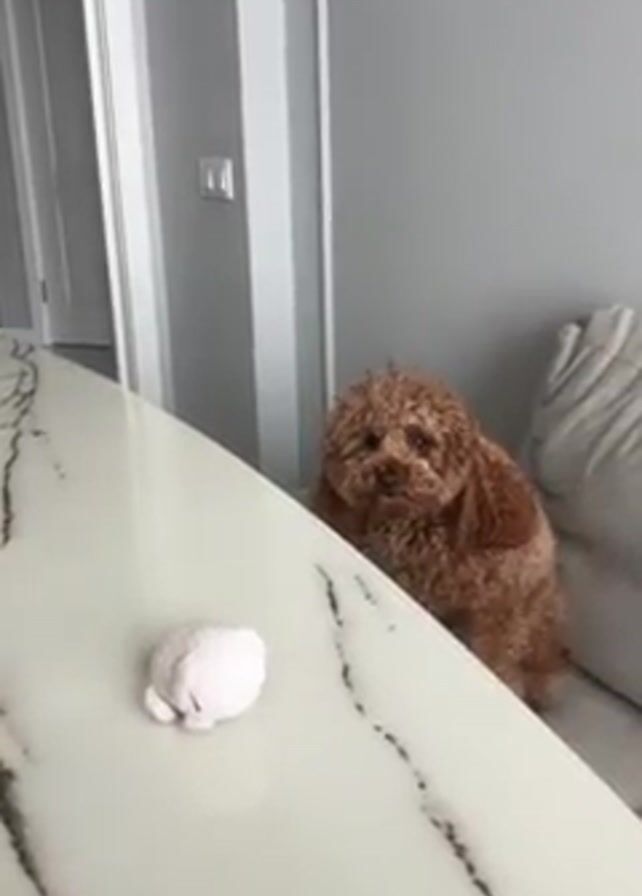 A person teases a brown poodle sitting on a couch behind a white marble-patterned table