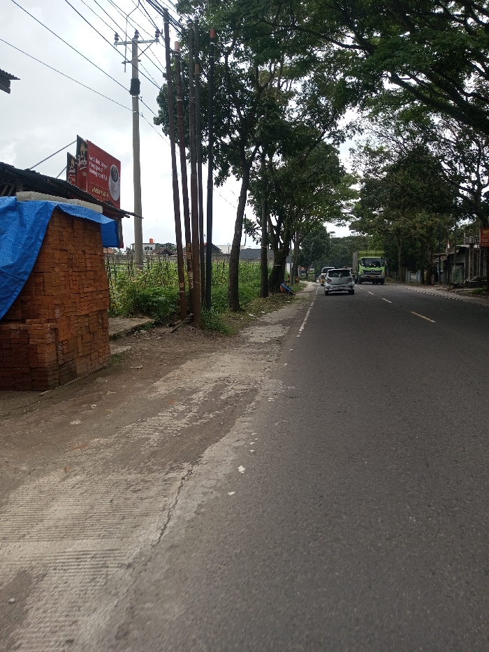 The scene depicts a roadside in Khajuripada, India, under an overcast sky. In the left foreground, a substantial stack of red bricks is partially covered by a blue tarp. Adjacent to this, a dirt and gravel shoulder transitions into a concrete section with horizontal grooves, leading to a two-lane asphalt road. A tall utility pole with overhead wires is positioned on the left, next to a cluster of five slender utility poles. Behind the poles, a field of green vegetation is visible, and further back, a red billboard displaying white text and an image of a cup is mounted on a structure. The road extends into the background, bordered by numerous deciduous trees with full green canopies. A silver compact car is driving away from the viewer in the left lane, with a green truck following further in the distance. An indistinct blue and white object or figure lies on the ground beneath trees on the right side of the road in the midground. No specific human actions or interactions are clearly discernible.