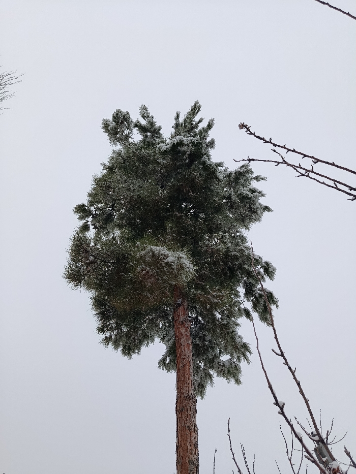 A tall, slender pine tree stands against a grey sky. Its trunk, reddish-brown, extends upwards. The tree's evergreen branches are dusted with light snow. Bare branches from other trees are visible to the right and left, their twigs ending in small buds. The overall scene suggests a winter landscape, perhaps after a light snowfall or frost. The color palette is muted, dominated by greys, browns, and greens.