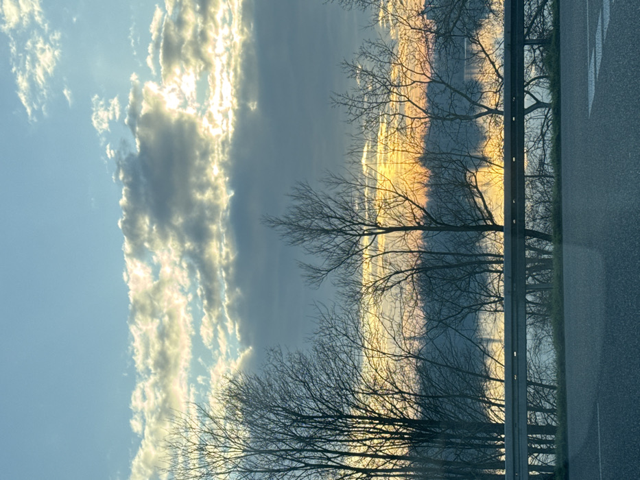 The image displays an outdoor scene in Altenheim, Germany, during either sunrise or sunset. In the immediate foreground, a dark asphalt road surface is visible. Above the road, a dark grey metal guardrail extends horizontally across the lower third of the frame. Beyond the guardrail, a dense line of bare deciduous trees, devoid of leaves, stands silhouetted against a bright horizon. These trees partially obscure a body of water, which reflects intense golden-orange light from the low sun. The upper portion of the image shows a partly cloudy sky, with horizontal formations of cumulus clouds illuminated from behind by sunlight, creating bright white and yellow areas within a light blue and darker gray-blue expanse. No individuals or specific actions are depicted in the scene.