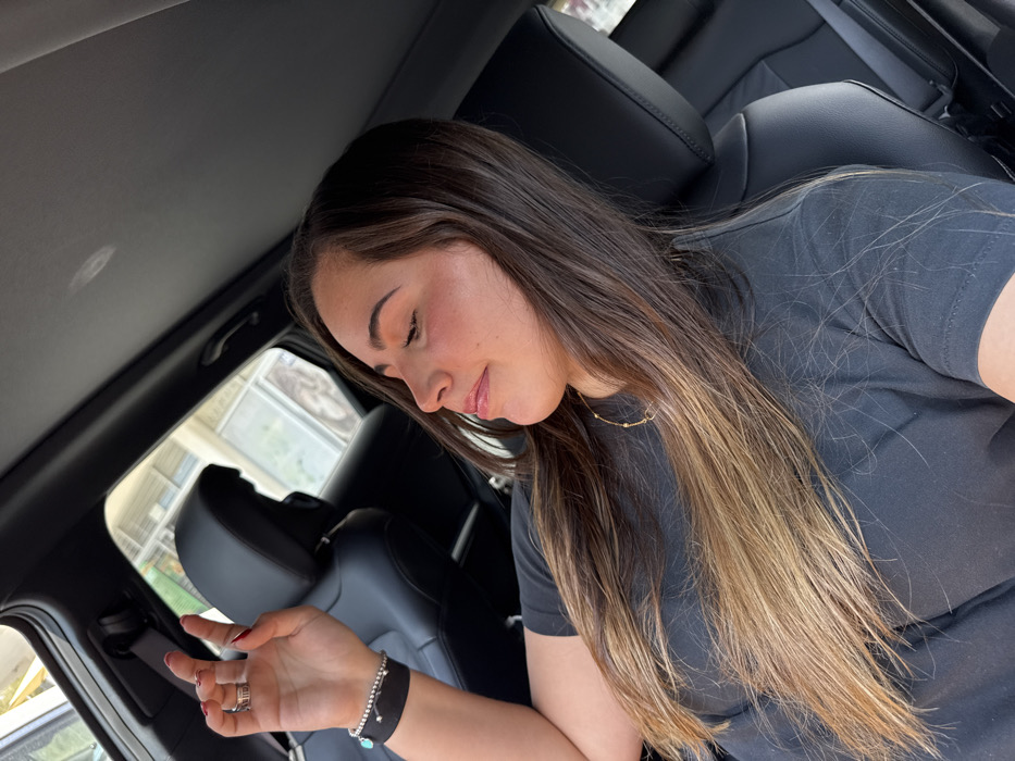A woman is seated in a car, looking down at her hand. She has long, brown hair with blonde highlights. The woman wears a black short-sleeved shirt, a delicate gold necklace, rings on her fingers, and a black and silver bracelet. The car's interior has black leather seats. Light streams in from the window.