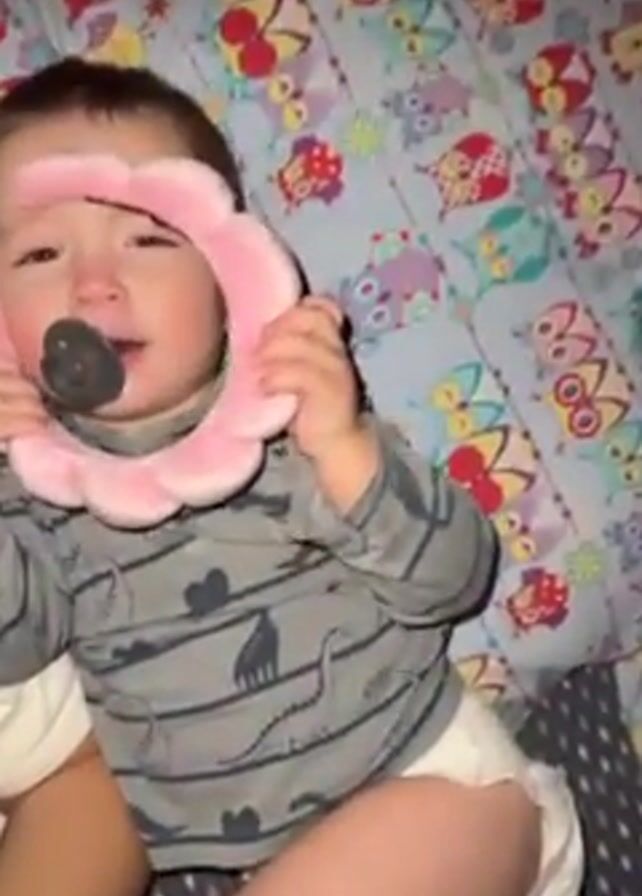 A baby lying on a patterned bed is seen from above. The baby is wearing a gray shirt with a dinosaur print and a diaper. They have a pacifier in their mouth and are holding a pink plush flower-shaped object around their neck. The baby looks up and reaches out towards the camera with their right hand, smiling. The bed has a patterned pillow with owls and a colorful quilt. A person's arm is visible on the left side of the frame, holding the baby.