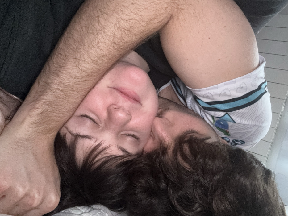 The scene depicts two individuals in an indoor setting, situated in Cortona, Italy. A male subject is positioned behind a female subject, with his right arm draped around her. He exhibits dark, curly hair and a hairy right forearm, and wears a white shirt detailed with light blue and black stripes. His head is angled towards the female, with his mouth appearing to make contact with her left temple or upper cheek area. The female subject has dark, straight hair partially covering her forehead, closed eyes, and a small, silver-toned hoop nose ring in her left nostril. She is wearing a dark upper garment. Both individuals are in a reclining posture. The immediate environment includes a white, quilted surface on the right, indicative of bedding, and a plain, light-colored background surface above.