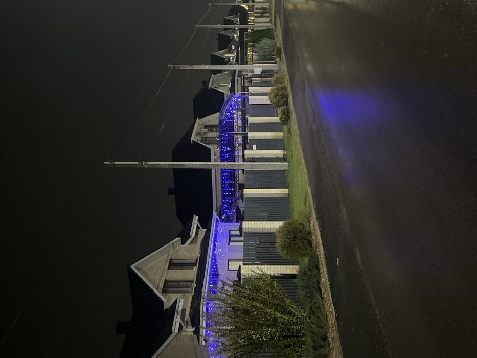 The image depicts a residential street scene at night in Tsibanobalka, Russia. The foreground features a wet, dark asphalt road, reflecting blue light from overhead sources. To the left of the road, a neatly maintained grassy verge contains a large, dense green bush and two smaller, rounded shrubs. Extending from the midground into the background on the left are a series of two-story residential houses. These houses feature light-colored facades, dark-tiled gable roofs, and multiple windows. The closest two houses are extensively decorated with blue icicle-style string lights draped beneath their eaves and over a covered structure, likely a carport or pergola, adjacent to each house. These lights cast prominent blue reflections onto the wet road surface. Separating the houses from the grassy verge are fences constructed from vertical grey slats interspersed with light-colored brick pillars. Multiple dark utility poles with overhead wires line the right side of the street, receding into the distance. The sky is dark and overcast, indicating night conditions. No individuals or vehicles are present in the scene.