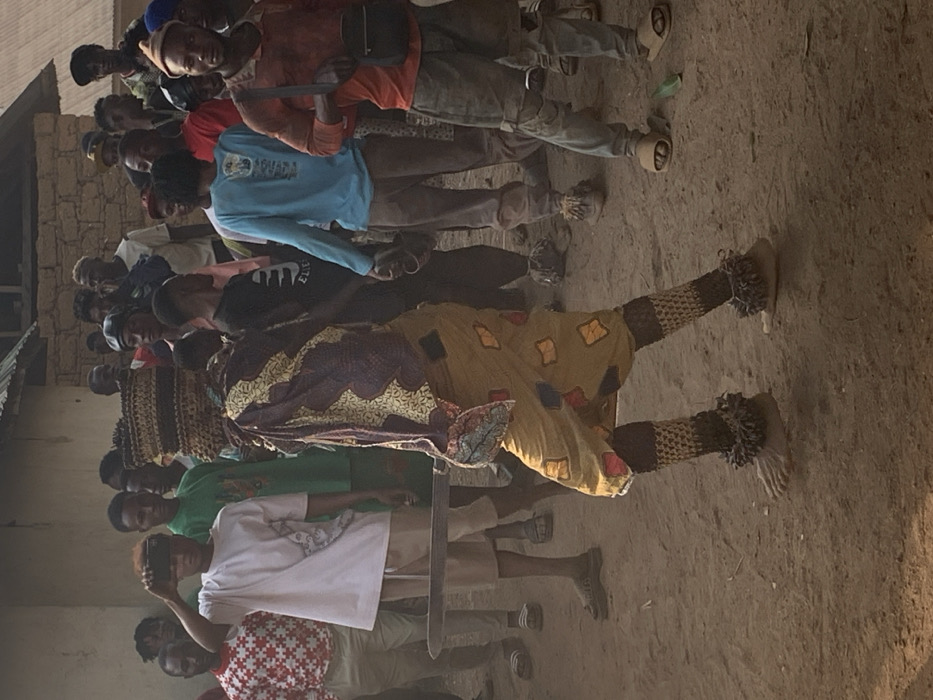 A group of people stands on a dirt ground, some looking at a central figure. The figure is adorned in patterned yellow and purple clothing, with elaborate leg coverings. Many in the crowd are casually dressed, with one person holding up a phone, possibly taking a photo. A building is visible in the background. The scene appears to be an event or performance taking place in an outdoor area.