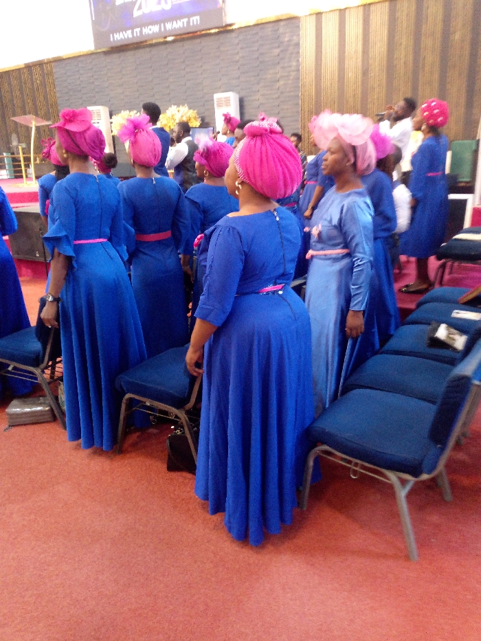 The image displays an indoor gathering in the city of Television, Nigeria. A group of individuals, predominantly women, stand in rows, facing generally forward or slightly to the right of the camera. Most women wear identical royal blue, long-sleeved, floor-length dresses, each cinched with a narrow bright pink sash or belt. Their heads are covered with prominent, voluminous bright pink wraps, except for one woman on the far right wearing a reddish-pink polka-dotted wrap. One woman in the mid-right wears a lighter blue dress, possibly satin, with a lighter pink sash. Partially visible in the background are several men, one of whom is holding a microphone. The floor is covered with a reddish-orange carpet. Rows of unoccupied blue fabric chairs with silver-toned metal frames are arranged throughout the foreground and midground. In the background, on the left, a raised stage is visible, also covered in red carpet, featuring a golden-colored podium and a cluster of yellow floral arrangements. A large banner or screen on the rear wall displays partial text including "2023" and "I HAVE IT HOW I WANT IT!". White rectangular units, appearing to be speakers or ventilation components, are mounted on the wall above the stage, which is backed by vertical wooden paneling.
