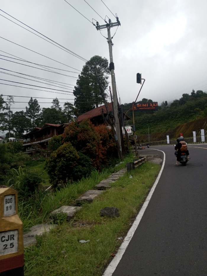 The image depicts an outdoor scene on a curved asphalt road in a hilly region under an overcast grey sky. While the location specified is Saing Ta Mawt Lay, Myanmar, the visible road markers prominently display 'BDG 89' and 'CJR 25', indicating distances to Bandung and Cianjur, respectively, consistent with West Java, Indonesia. In the foreground left, a yellow and black concrete road marker stands on a grassy verge that also features irregular concrete blocks. A grey concrete utility pole, laden with multiple dark overhead wires, rises on the left side of the road. To its right, a black, vertically oriented traffic light head is suspended over the roadway on an angled arm. Further up a green, misty hillside, a large brown sign with white text reads 'BUMI AKI' and 'www.bumiaki.com'. Below this, a smaller white sign is partially visible. To the left of the utility pole, partially obscured by dense green and reddish-brown foliage, a multi-story building with dark tiled roofs and wooden siding is nestled into the terrain. On the dark asphalt road, a dark-colored scooter carries two individuals wearing helmets, traveling away from the camera along the curve. The driver wears a dark jacket, and the passenger has a light-colored backpack.
