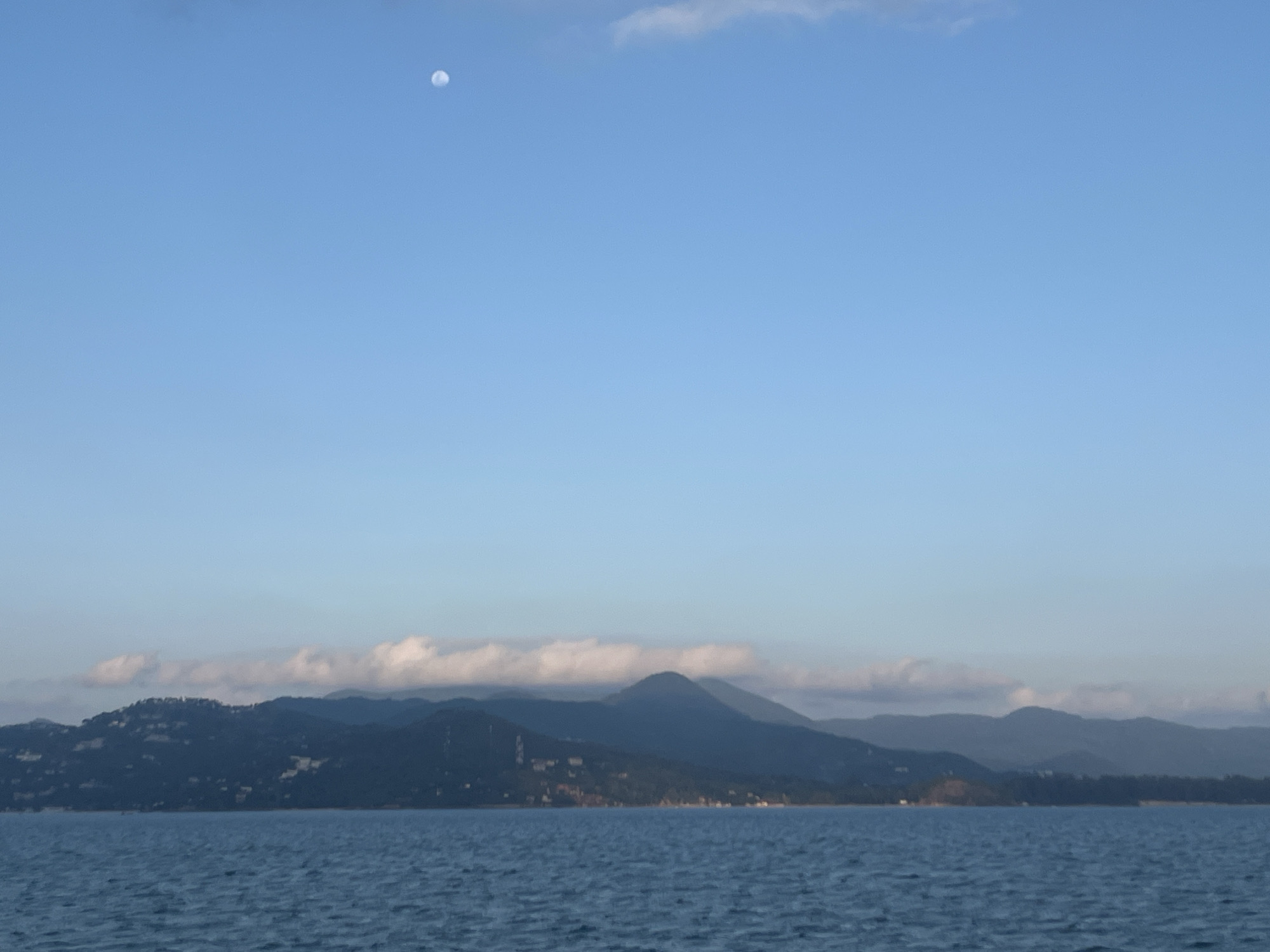 seascape with land in the background. The foreground is a body of water with small waves. In the middle ground are dark, hilly landmasses shrouded in low-lying clouds. Above the land, a large expanse of pale blue sky dominates, featuring a small, almost full moon and a few wispy clouds. This scene is located in Baan Sri Thanu, Thailand.