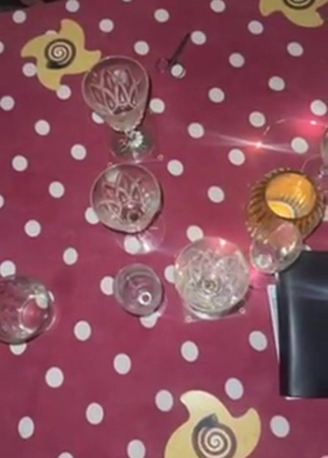 The camera shows a table covered with a patterned tablecloth, set with various glassware items