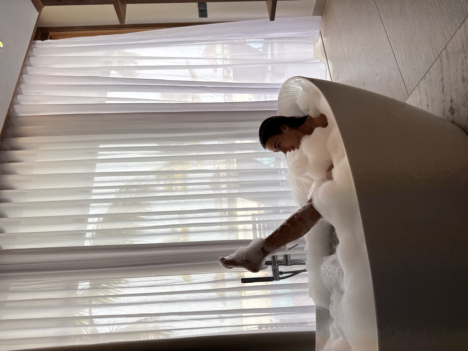 A woman relaxes in a large, white, egg-shaped bathtub filled with bubbly foam. Her dark hair is slicked back, and she gazes downward. Her leg extends out of the tub, her foot visible near the faucet. A bright window covered with white blinds and sheer white curtains is in the background, letting in ample natural light. The bathroom wall to the right appears to have a light gray, textured finish.