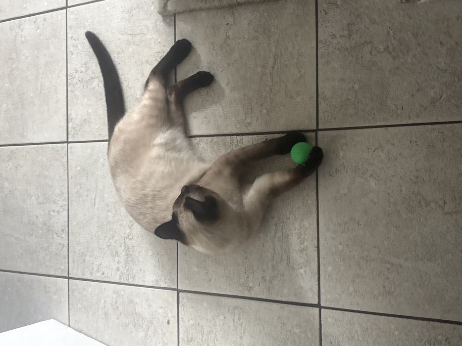An overhead photograph captures a single Siamese-type cat lying on a light-colored tiled floor. The cat exhibits a cream-colored body with distinct dark brown "seal" points on its face, ears, front paws, rear legs, and tail. It is positioned on its left side, with its body slightly curved. Its head is turned to its right, oriented towards its extended front paws. A small, spherical, bright green object, appearing to be a toy ball with a textured surface, rests directly beneath the cat's front left paw. The cat's tail is extended straight out to the right, and its rear legs are bent. The floor is composed of square ceramic tiles with dark grey grout lines. A section of a light-colored, possibly shaggy rug is visible on the far right edge of the frame, near the cat's hindquarters. A white vertical surface is present in the upper left corner. The specific location within the city of Esch-sur-Alzette, Luxembourg, cannot be ascertained from the visual evidence.