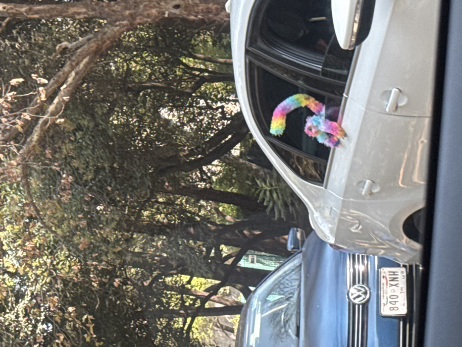 A daytime photograph depicts a street scene in Mexico City, Mexico, featuring two stationary automobiles positioned against a dense backdrop of trees. In the left foreground, the front of a blue Volkswagen sedan is visible, displaying a Mexican license plate number 840-XNH. To its right, the rear passenger side of a white or light grey sedan occupies the midground. A multi-colored, plush, fuzzy toy, resembling a creature with a long, curved tail, extends from the partially open rear passenger window of the white sedan. The toy exhibits distinct bands of blue, purple, pink, yellow, green, and orange. The background consists of a thick canopy of mature trees with predominantly green foliage, indicating a heavily vegetated urban area. No individuals are visible within the frame.
