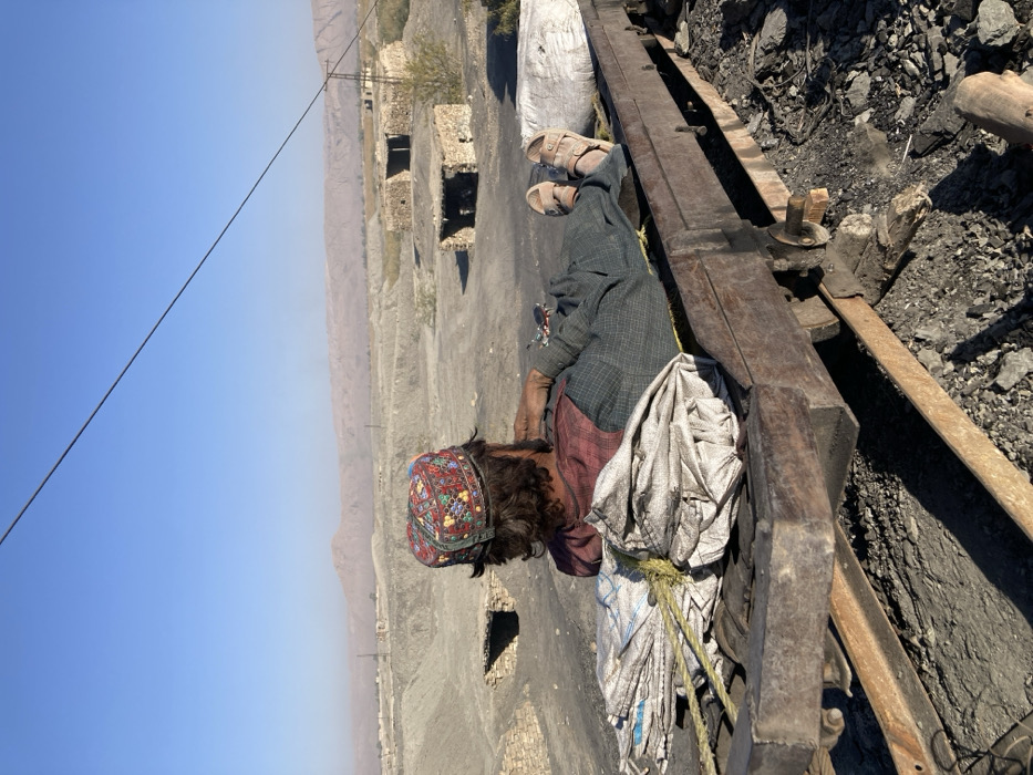 An individual wearing a colorful cap, a gray and red plaid shirt, and tan sandals sits on a weathered, dark wooden structure. A large white bag is to the side, bound with rope. The surrounding area is a dusty, gray landscape with dilapidated stone structures. A vast mountainous terrain stretches into the distance under a clear blue sky, with a lone power line cutting through the view. The immediate foreground is cluttered with rocks and debris.