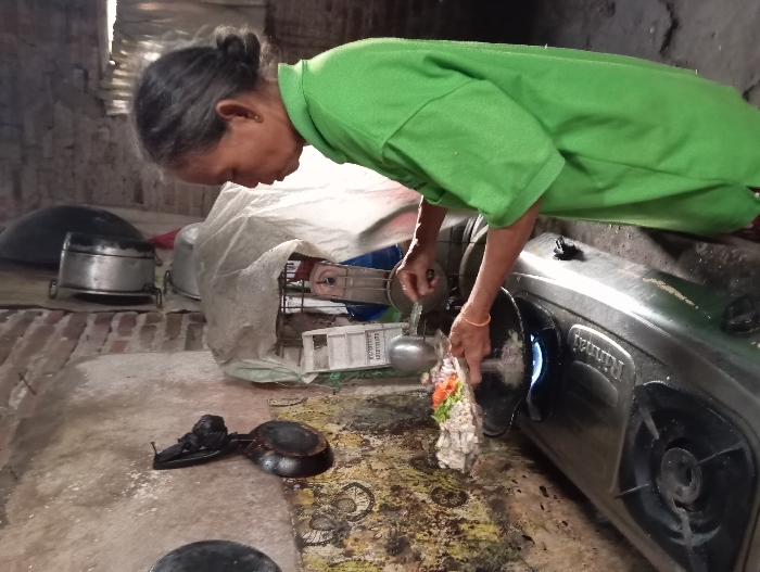 An elderly woman is actively cooking in a modest kitchen located in Baron, Indonesia