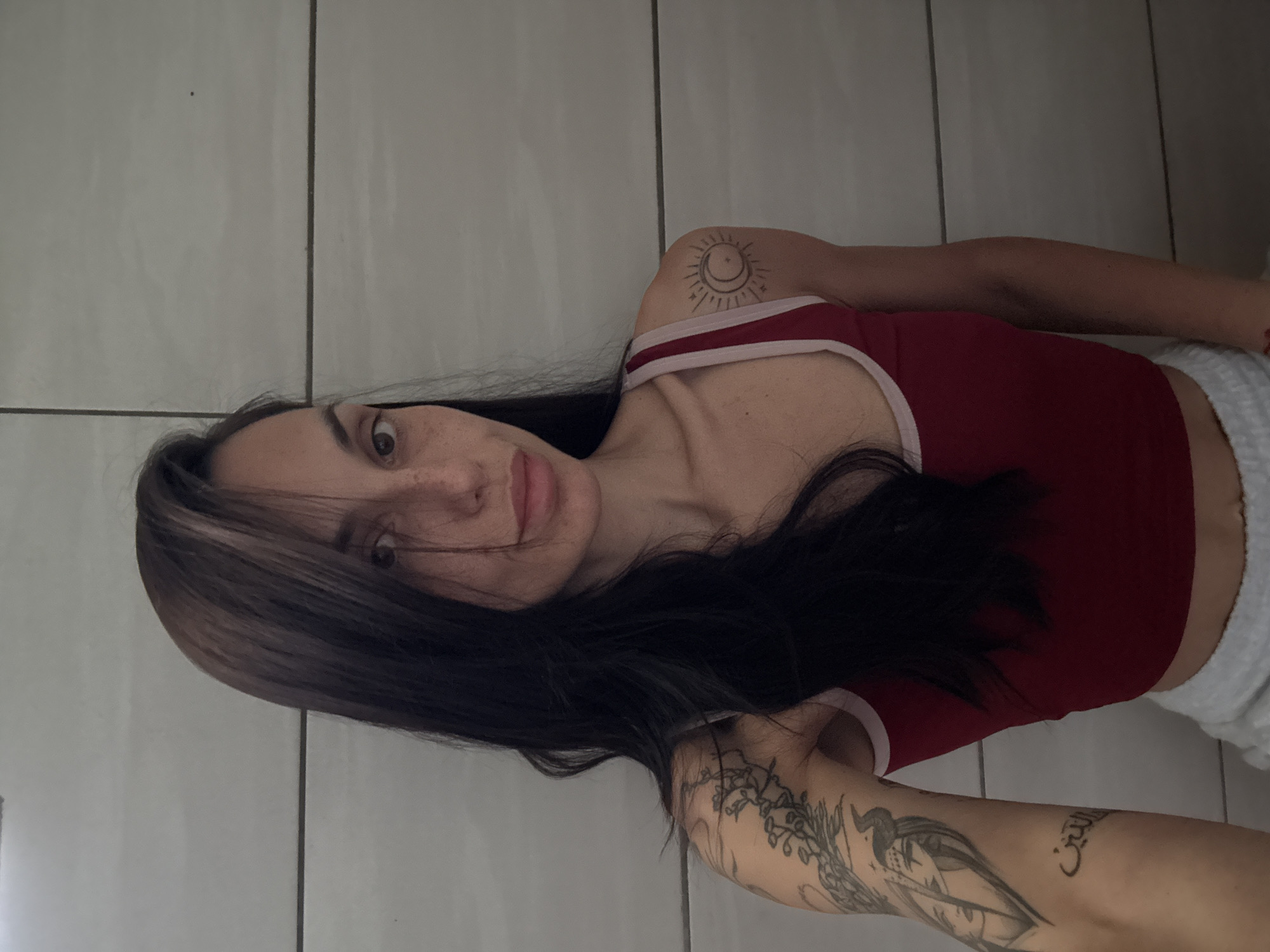 A woman with long dark hair and freckles is lying down, wearing a red tank top with white trim and white shorts. She has tattoos on both arms, one a sun/moon design on her upper arm, and another larger tattoo on her forearm. The background is a tiled wall. The location is unknown.