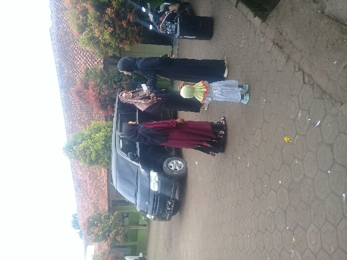 The scene is a street in Kecamatan Cimaung, Indonesia, located at the coordinates -7.068 latitude and 107.554 longitude. There are three women standing in front of a black car. The woman on the left is wearing a black hijab and a black dress, while the woman in the middle is wearing a brown and white dress. The woman on the right is wearing a red and black dress and a black hijab. A young girl is standing between the two women on the right, facing the camera. The girl is wearing a light green and yellow dress, and her back is to the camera. The woman in the middle is handing the child a gift. The scene appears to be taking place outside a residence with red and brown tile roofing. The ground is paved with grey and white stones. The scene appears to have taken place in the daytime.