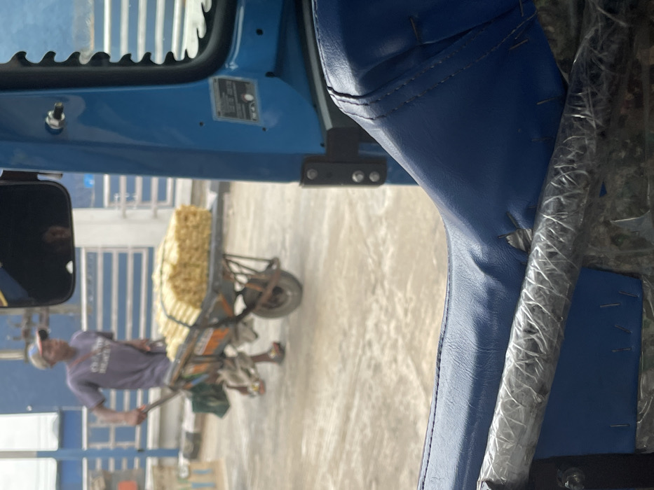 This image depicts an outdoor scene in Yenegoa, Nigeria, observed from the interior of a vehicle, likely a commercial tricycle. The foreground shows a worn blue faux leather seat, exhibiting small tears and exposed staples. Below the seat, a metallic bar is visible, wrapped in clear plastic or tape. To the right, a section of the vehicle's blue frame, a side window with a distinctive serrated edge, and a rearview mirror containing a faint human reflection are present. In the midground, an adult male is actively pushing a single-wheeled wheelbarrow across a light-colored paved surface. He wears a grey short-sleeved t-shirt, a blue and beige baseball cap, and colorful sandals. The wheelbarrow is heavily loaded with numerous bundles of a yellowish, fibrous material, consistent with sugarcane sticks, arranged horizontally and secured by straps. A green bag hangs from the left handle of the wheelbarrow. The background features a light blue building or structure with horizontal bars or fencing, and a partial view of a grey curb on the left. The scene is illuminated by ambient daylight.