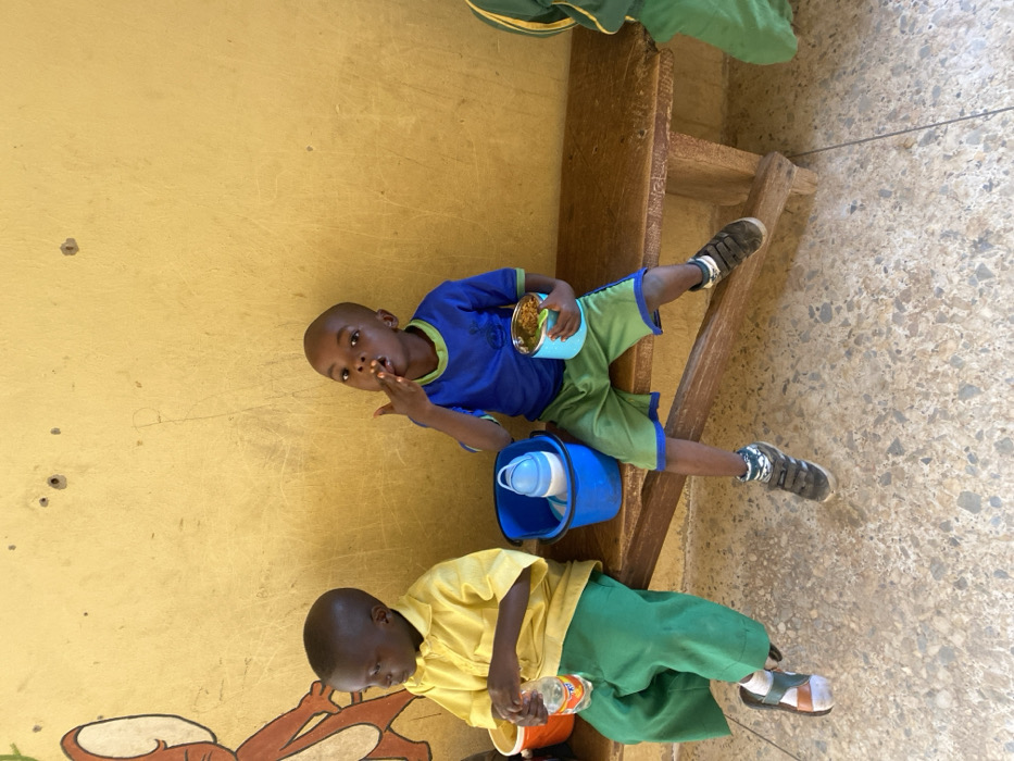 Two young male children are seated on a worn wooden bench against a yellow-painted wall, observed in Akwanga, Nigeria. The wall displays scuff marks, small holes, and a partial cartoon drawing of a light brown animal on the left. The child on the left wears a yellow collared shirt, green trousers, and sandals, holding a clear plastic water bottle with an orange cap in his right hand, looking to his left. The child in the center wears a blue t-shirt with a green collar, green shorts, and black athletic shoes, holding a light blue cylindrical food container with visible contents in his left hand. His right hand is positioned with fingers near his mouth, and he is looking directly forward. Between the two children on the bench rests a blue plastic bucket containing a white and blue water bottle. A third individual, partially visible on the far right, wears green trousers. The ground beneath the bench is a light-colored, speckled terrazzo or concrete surface with faint seam lines.