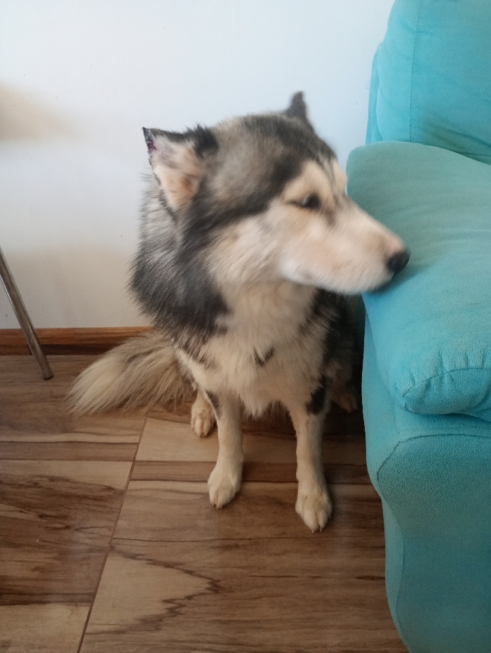 - "A medium-sized husky dog sits on a light brown wood-patterned tile floor next to a bright turquoise sofa" by FM-skUe82, licensed under CC BY 4.0