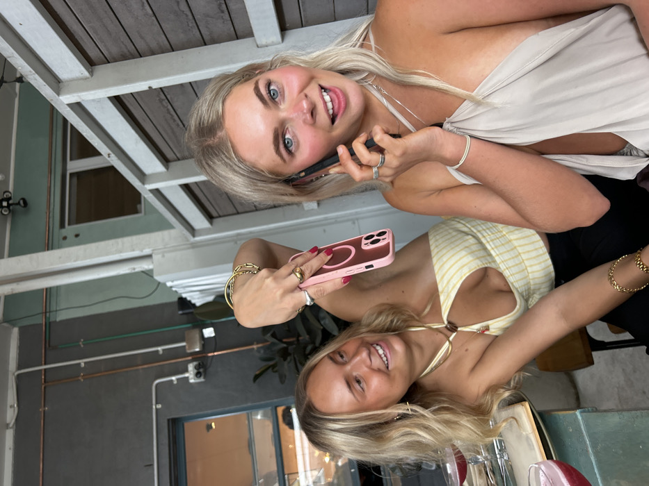 Two young blonde women pose indoors. The first woman, on the top, wears a cream top and talks on a black phone. The second woman holds a pink phone and wears a yellow striped top. Both women smile at the camera. The setting includes a white-painted wooden ceiling, a window, exposed copper pipes, and a grey wall. Wine glasses are visible in the foreground.
