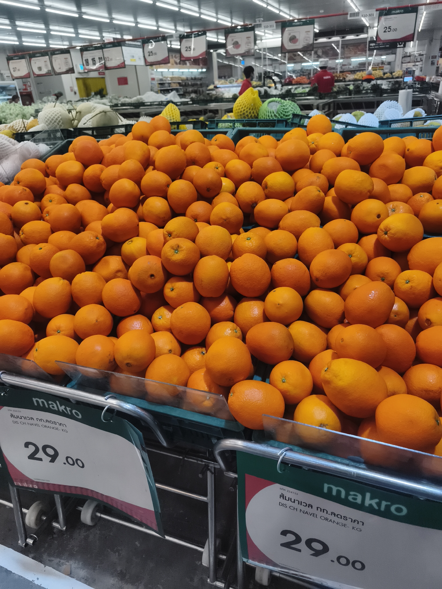 This image shows a large display of oranges at a Makro store in Baan Bo Phut, Thailand