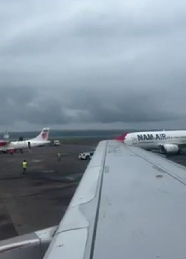 view from an airplane window of a runway on a cloudy day. On the left side of the frame, there is a smaller aircraft with ground personnel working around it. To the right, a larger aircraft labeled "NAM AIR" is visible. The wing of the plane from which the video is being taken occupies the lower part of the frame. The overall setting appears to be an airport tarmac under overcast skies.