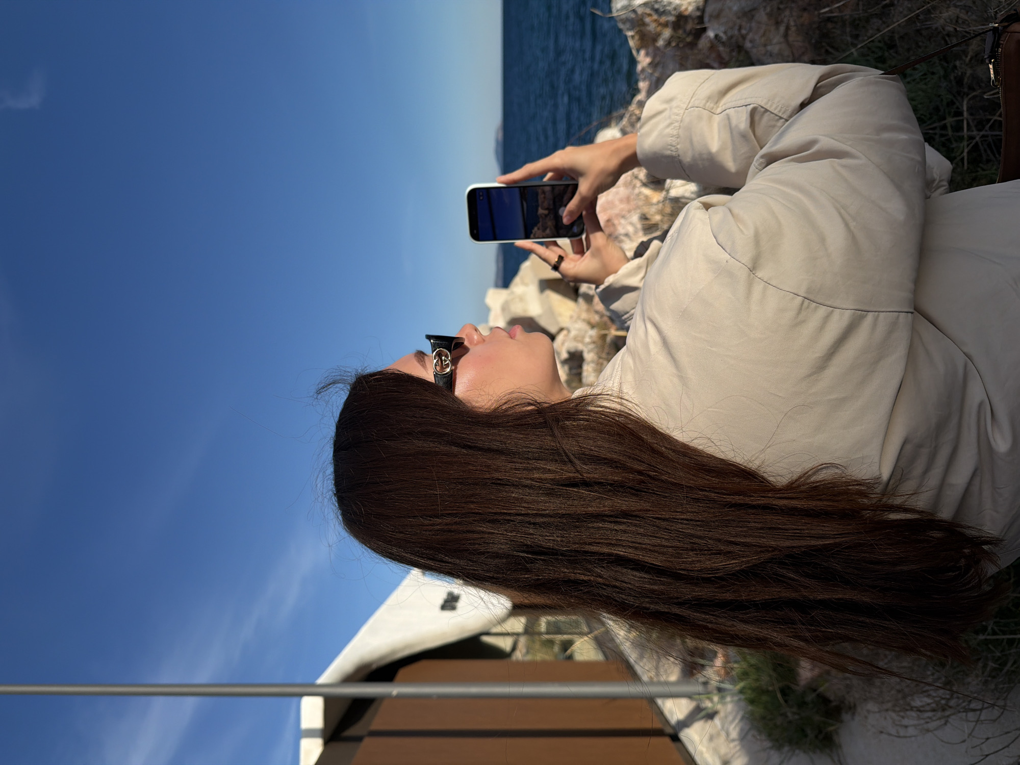A woman in sunglasses and a tan jacket is taking a picture of the ocean with her smartphone. The scene is set outdoors, likely in the Vouliagmeni Municipal Unit, Greece. The sky is blue, and the ocean can be seen in the background. The woman is positioned near some rocks.