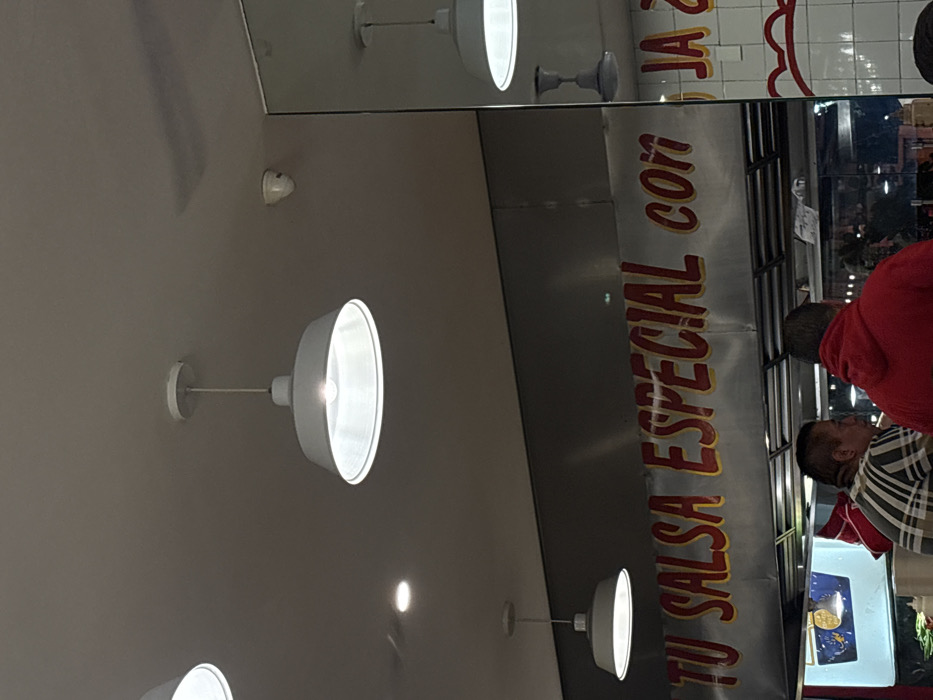 The scene captures a partial interior view, focusing on ceiling fixtures and a mirrored wall. Three white, industrial-style lights hang from the ceiling, casting light downwards. The mirrored wall reflects the lights and part of a restaurant or food stall. The sign says “TU SALSA ESPECIAL con JA”, and people can be seen in the mirrored reflection.