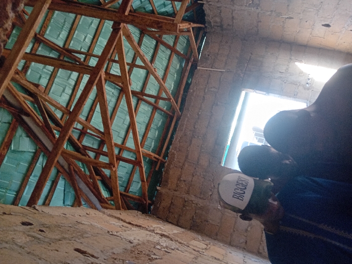 This image depicts an interior space within a building in Lafia, Nigeria. The environment consists of unplastered concrete block walls, exhibiting rough textures and visible mortar. A structural element, possibly an older wall or foundation, is present on the left. Overhead, an exposed wooden roof truss system is visible, supporting light green corrugated metal sheets that form the underside of the roof. Three individuals are present in the lower frame, largely silhouetted against a bright outdoor light source entering through an open window or doorway in the background. The leftmost individual wears a white baseball cap with "BIGGEST" written in black capital letters on the front, and a dark blue garment with light-colored embroidery. This individual's head is slightly lowered. Two other individuals stand to the right, mostly obscured by shadow and viewed from behind, making specific features, clothing, or actions indistinguishable. All individuals are standing upright, their specific actions or interactions are not clearly discernible beyond their presence in the room. The perspective is from a low angle, looking upwards towards the roof and individuals.